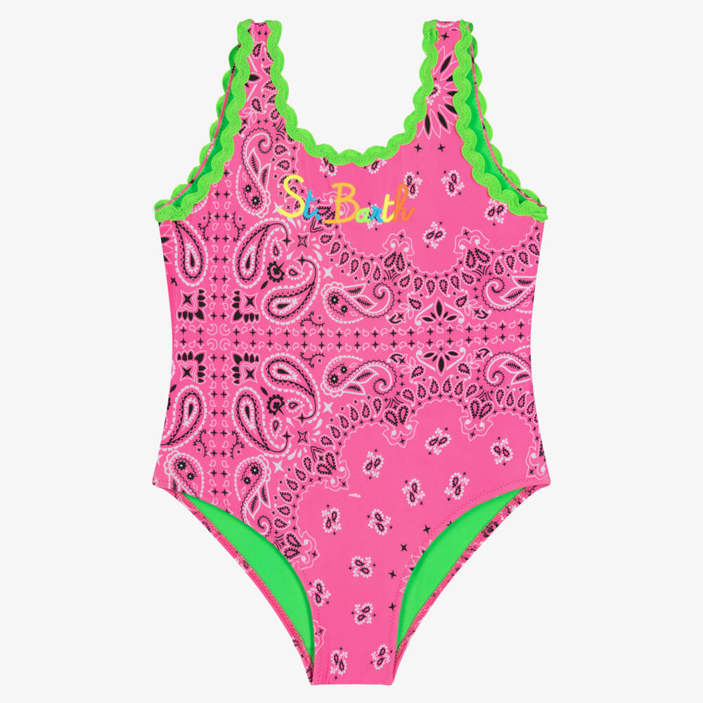 A fluorescent pink Italian-crafted swimsuit for girls by MC2 Saint Barth. Silky, stretchy and fully lined for comfort, the fabric is enhanced by a white and black bandana-inspired paisley pattern. Neon green ric rac trims and the brand's embroidered rainbow logo add fun splashes of colour to this vibrant one-piece. It is designed with a scooped back feature, with a branded label stitched below to finish the look.