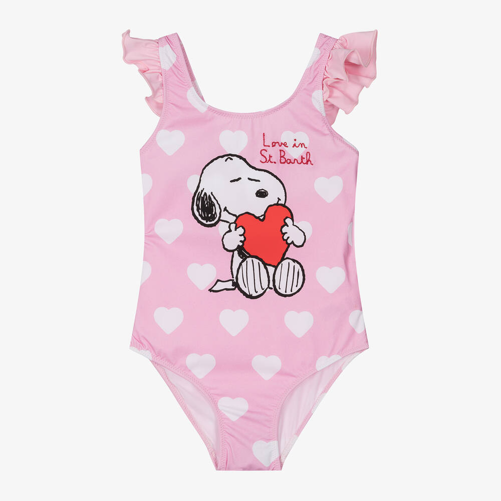 A light pink swimsuit for girls by MC2 Saint Barth, made in silky smooth and stretchy fabric for comfort. Patterned with white love hearts, this fully lined one-piece is designed with a cute Snoopy print on the front. There are pretty frills on the shoulder straps and a logo label on the back. 'Love in St. Barth' is stitched just below the neckline in red.