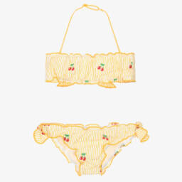 Stylish white and pink bikini for girls by MC2 Saint Barth, with a charming tropical toile de jouy print and pretty ruffle trim. Smooth and stretchy, the top has an asymmetric one-shoulder look, with an adjustable strap on the other side. The matching bottoms are gently elasticated to allow comfort and a good fit.