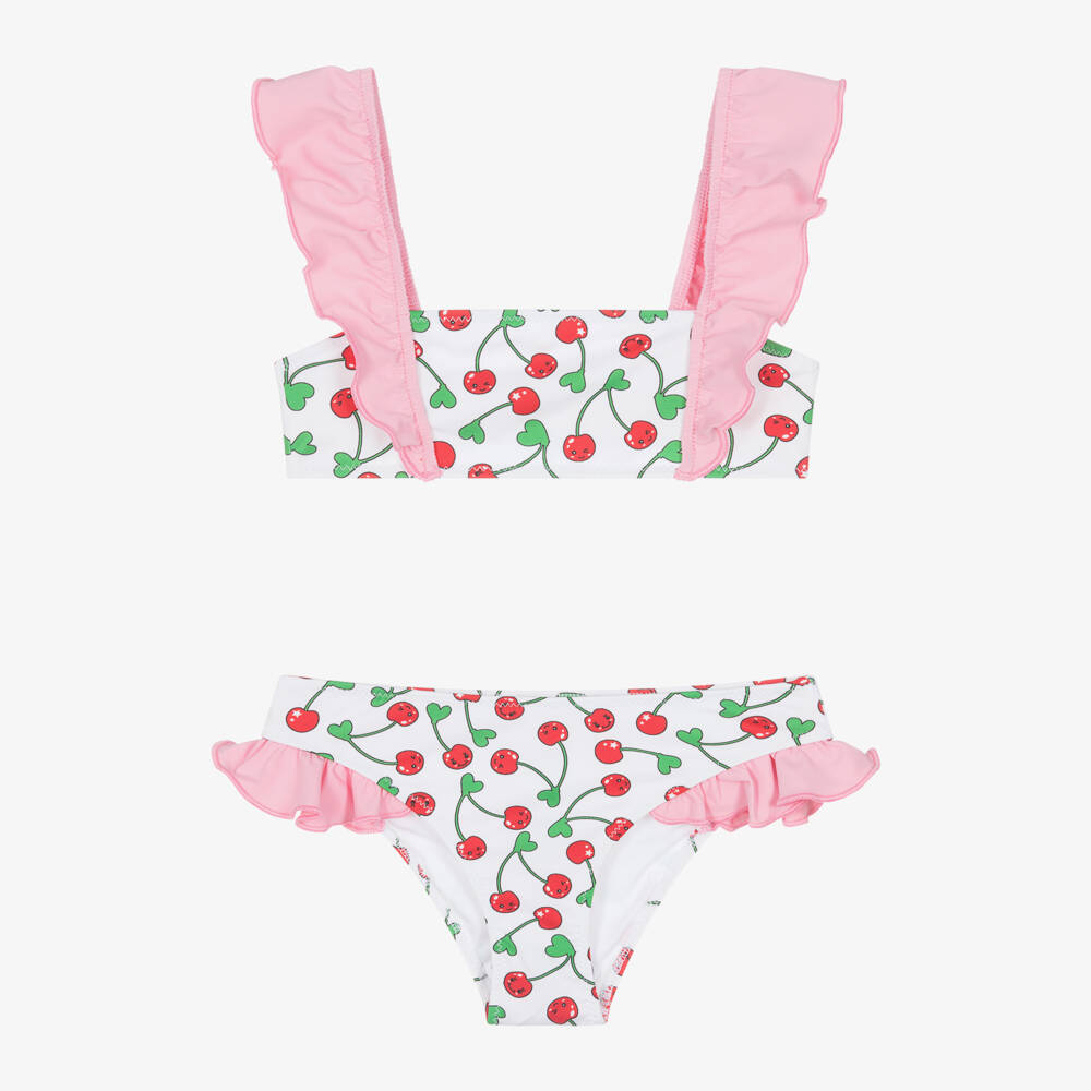 White bikini for girls by MC2 Saint Barth, patterned in a playful red cherry and green heart print. Silky soft and stretchy, this stylish two-piece has pretty pink ruffle trims, and is fully lined for comfort. A small logo tab is sewn on the back of the bottoms.