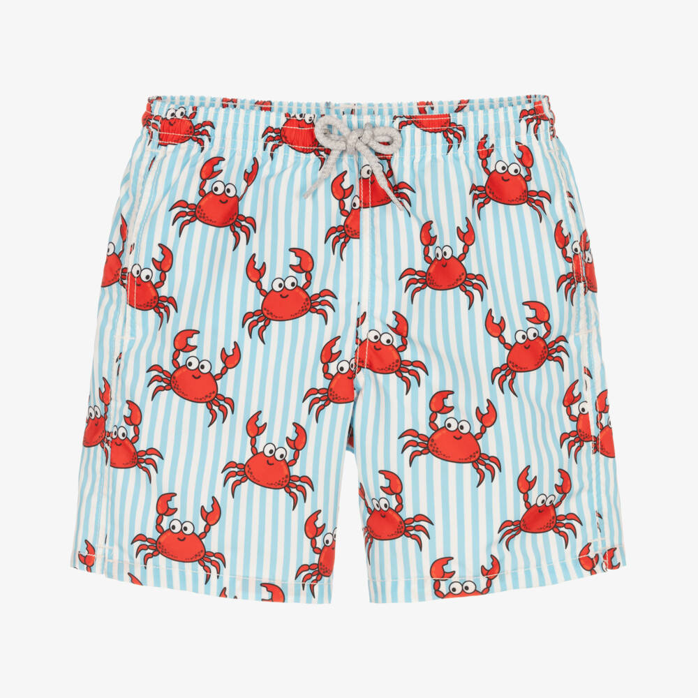 Cool pale blue and white striped swim shorts for teen boys by Italian swimwear brand MC2 Saint Barth, with a fun print of red crabs. Made with beautifully soft, peached and recycled fabric, they have useful, concealed pockets on the side seams and an extra flap pocket on the back, secured with velcro. The waistband has a grey drawstring for a good fit and a logo badge around the back. They have a soft mesh lining for comfort and come with a handy ID strap.