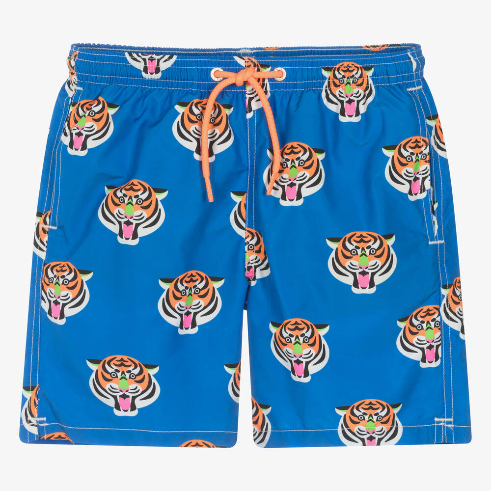 Bright blue swim shorts for teen boys by MC2 Saint Barth, patterned in a cool and vibrant tiger print. Silky smooth and lightweight, with a soft mesh lining, the fabric is made using recycled material. There is an elasticated drawstring waistband for an ideal fit, with useful side seam pockets and an additional flap pocket on the back. A logo tab on the back adds a designer finish.