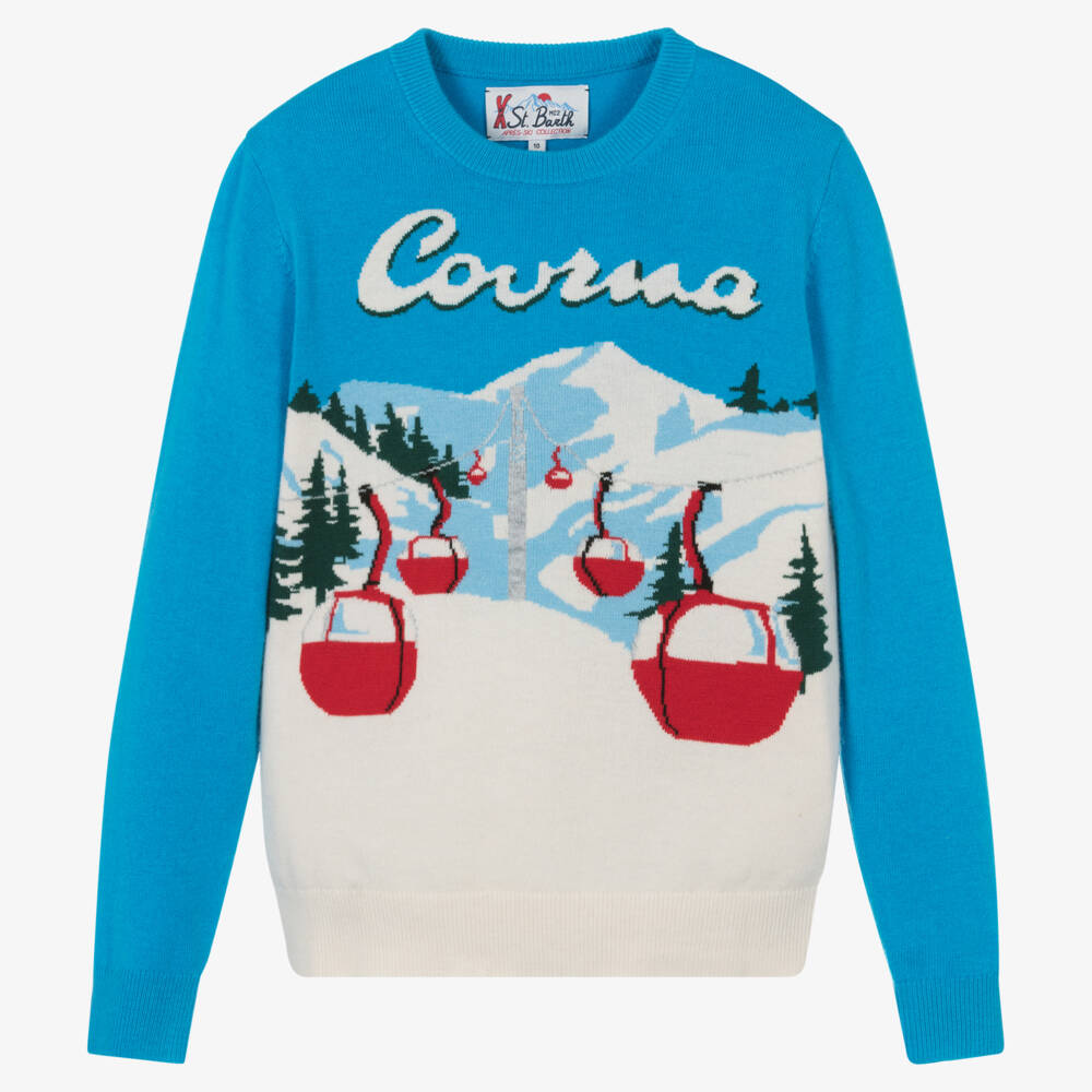 Bright blue jumper for teen boys by MC2 Saint Barth, with an embroidered logo on the cuff. Part of the brand's Après Ski collection, it has a ski-themed vintage postcard design of Courmayeur with a snowy mountain and chairlift in red, white and blue. This classic crew neck style is knitted in a luxuriously soft wool and cashmere blend with cosy ribbed trims.
