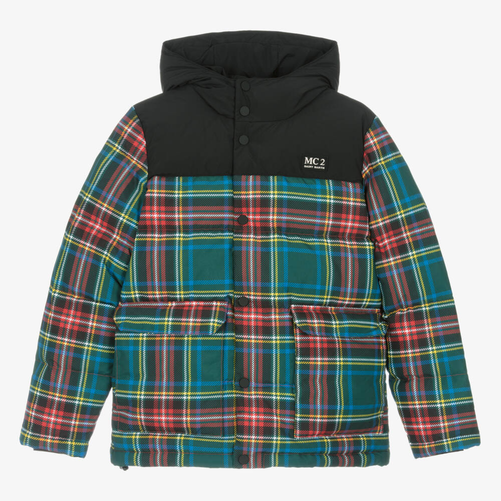 A luxurious dark green down-filled puffer coat for teen boys, designed by MC2 Saint Barth in a tartan check. Collaborating with animated series Peanuts, it has a striking Snoopy graphic printed on the back for a cool, retro look. The signature rubberised logo and checkerboard label are detailed for a branded touch. It has popper-fastening front pockets, a large hood and an internal toggle drawstring hem. It fastens with a zip and popper placket and has an internal pocket to store media devices.