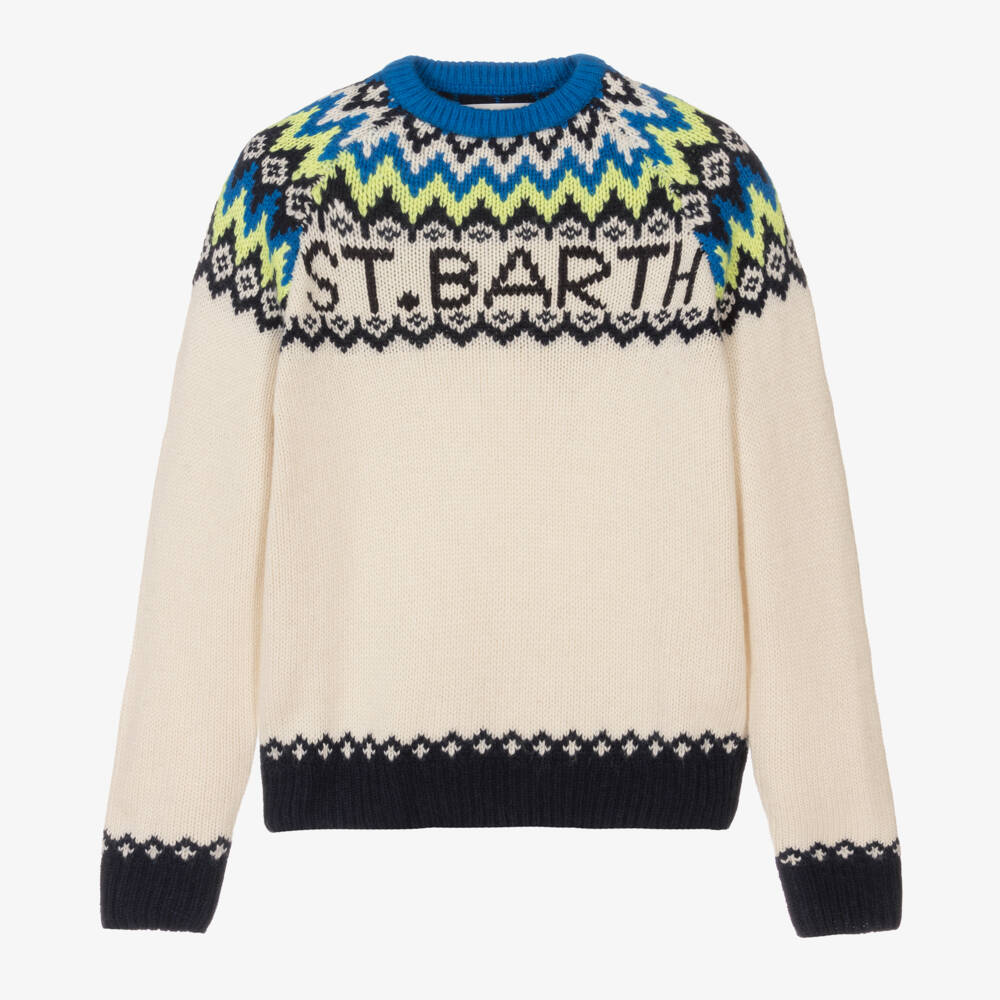 Channel Après Ski style in this ivory jumper for teen boys and girls by MC2 Saint Barth. Within the blue and green Fair Isle pattern is the brand's intarsia logo for an added designer touch. Warm and comfortable, it is made in a luxurious wool, cashmere and alpaca blend.