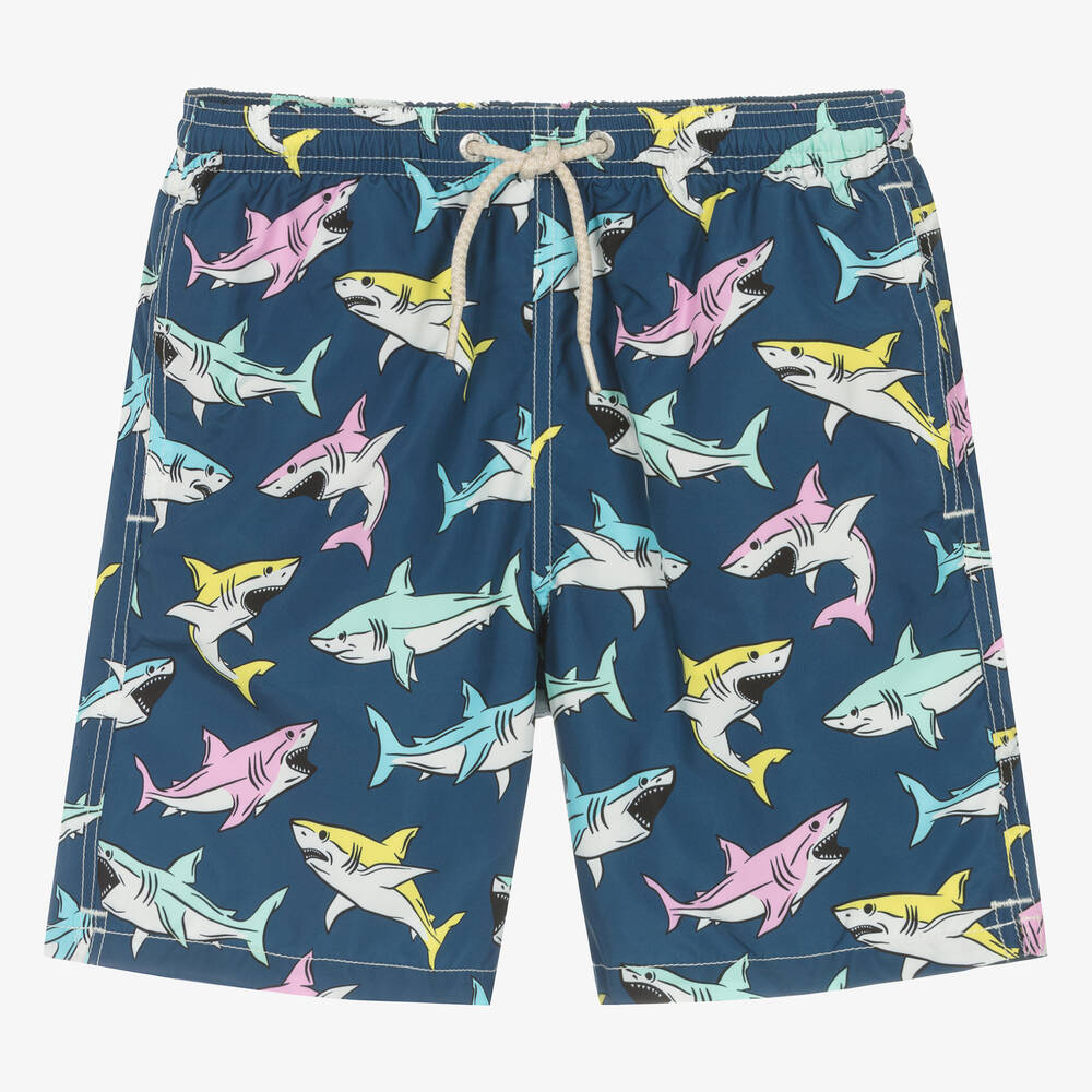 Patterned in a fun and colourful shark print, these navy blue swim shorts for teen boys are by MC2 Saint Barth. Silky smooth and lightweight, with a soft mesh lining, the fabric is made using recycled material. There is an elasticated drawstring waistband for an ideal fit, with useful side seam pockets and an additional flap pocket on the back. A logo tab on the back adds a designer finish.