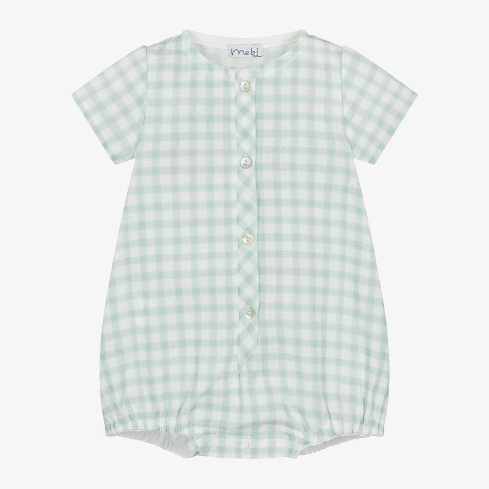 A lovely green check shortie for baby boys by traditional Spanish brand Mebi, made in beautifully lightweight textured cotton. Ideal for warmer days, it has short sleeves and gently elasticated cuffs, with mother of pearl button fastenings on the front and between the legs. Mebi is a very small fitting brand, please choose a size up to allow room to grow.