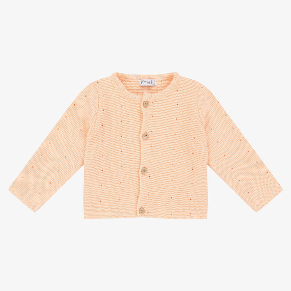 Pastel orange cardigan for baby girls, by Mebi. Knitted in soft and lightweight cotton, it has a sweet cut-out dotted design and wooden-style buttons on the front.