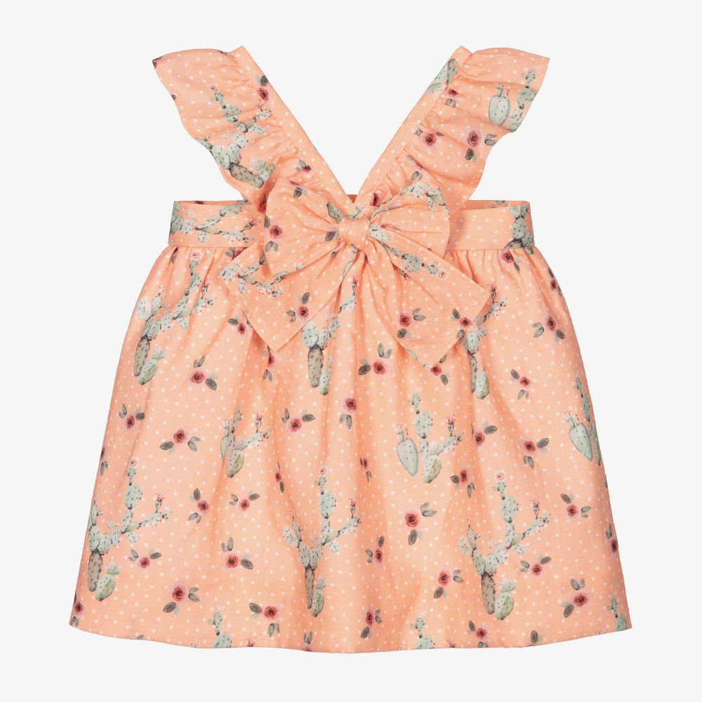 Cute, peach pink pinafore dress for baby girls by Mebi, with a cactus, floral and white dot pattern. Made in a lightweight linen and cotton blend, it has a bow on the front and frilled trim on the shoulder straps. The dress is comfortably lined in lightweight cotton and fastens with mother-of-pearl buttons on the back.