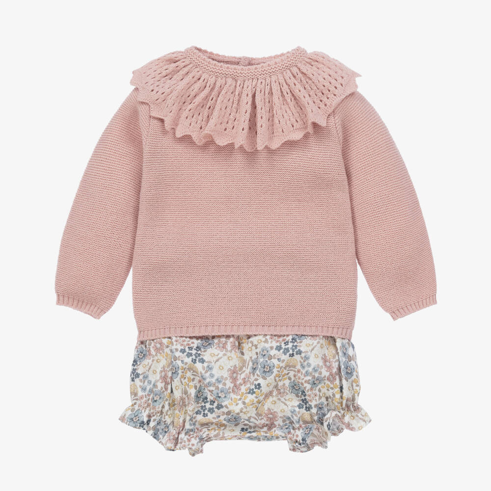 Sweet sweater and shorts set for baby girls by traditional Spanish brand Mebi, exclusive to Childrensalon. The pink sweater is knitted in soft acrylic and has a beautiful ruffled and scalloped collar. It has cosy ribbed cuffs and fastens with pretty mother-of-pearl buttons on the back. The lightweight cotton shorts have a pretty blue, pink and yellow floral pattern on an ivory background. They are beautifully comfortable, with lots of room and an elasticated, frilled waistband with matching cuffs.