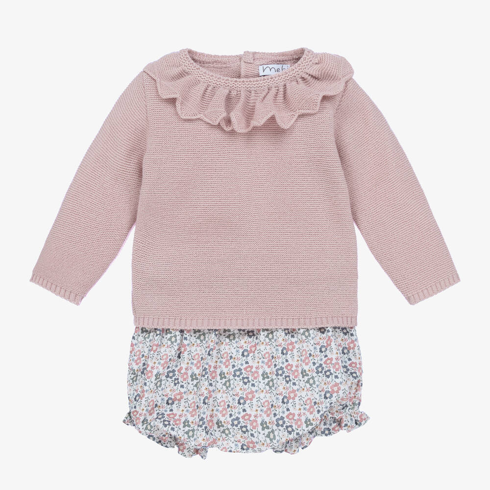 A lovely dusky pink shorts set for baby girls by Mebi. The long-sleeved sweater is made from a soft knit and has a cute zig-zag collar for a sweet look. It fastens with mother-of-pearl buttons on the back and has narrow ribbed trims. Patterned with a pretty floral print on a white background, the bloomer-style shorts have frilled trims and a comfortable elasticated waistband. Mebi is a very small fitting brand, please choose a size up to allow room to grow.