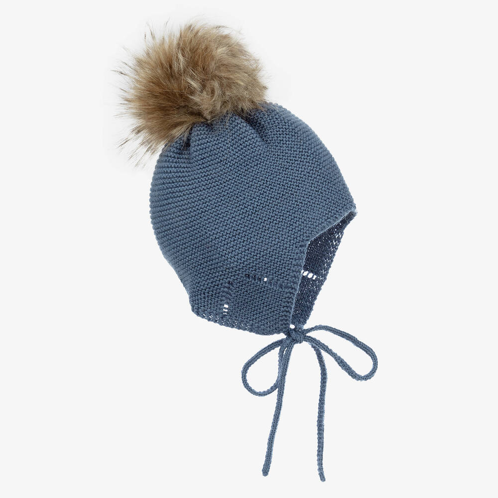 Cute mid-blue knitted hat for little boys and girls by Spanish brand Mebi. It has an adorable faux fur pom-pom on the top and ties under the chin.