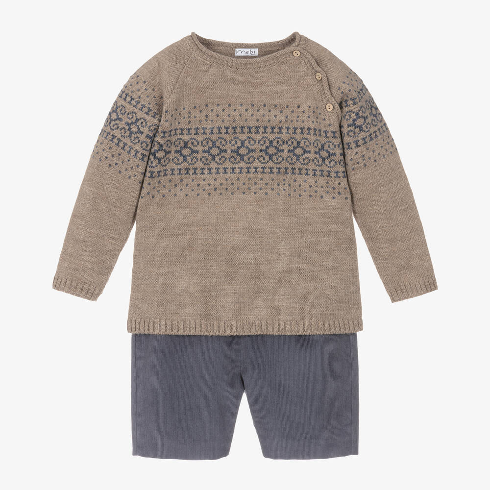 Lovely beige and blue shorts set for younger boys by Mebi. The beige knitted sweater has a blue fair isle pattern across the front and back for a classic look. It has comfortable ribbed trims and useful button fastenings on the front. Designed with a stretchy waist, the blue shorts are made in soft cotton corduroy and lined in cotton voile for comfort against the skin.