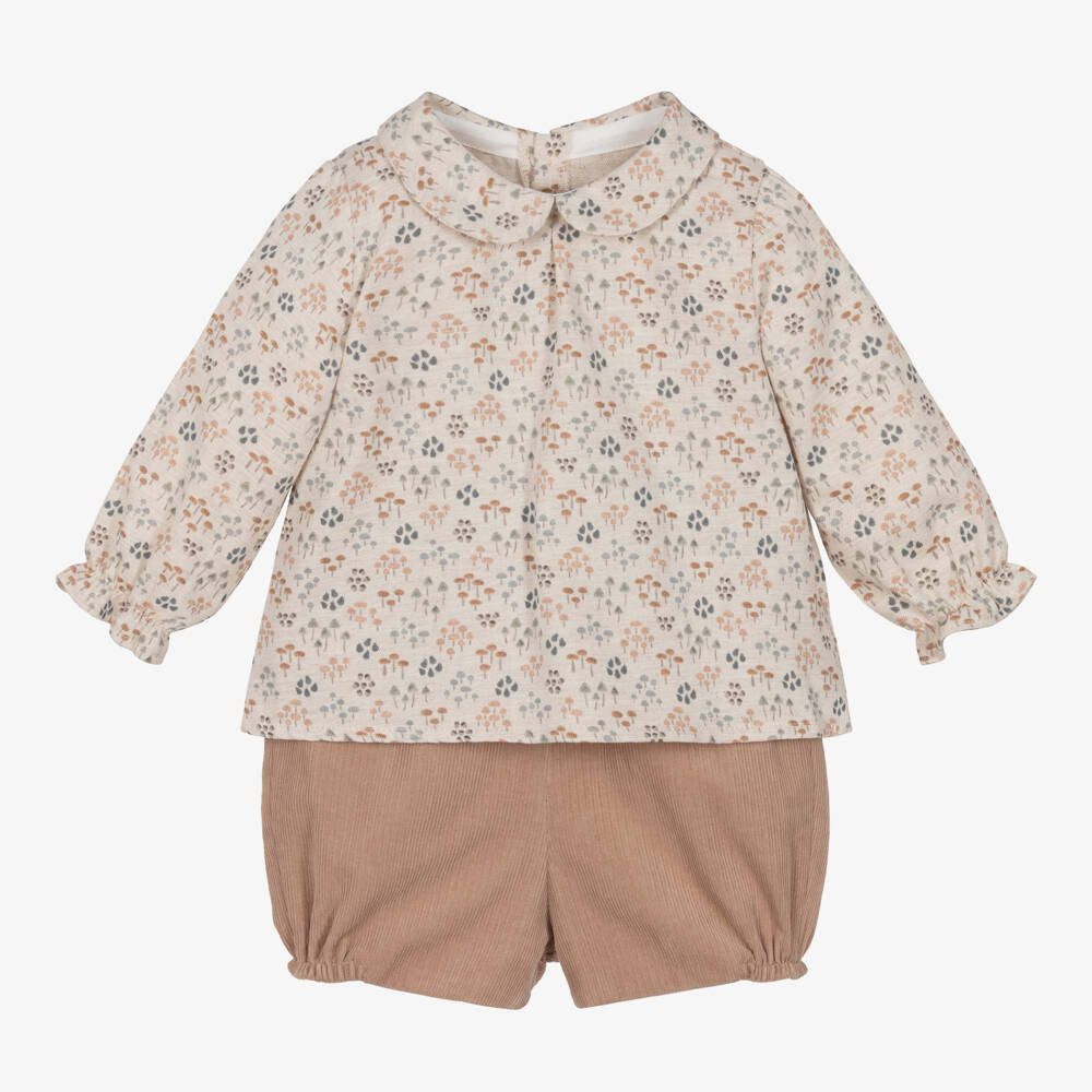 Smart casual two piece shorts set for little boys by traditional Spanish brand Mebi. The beige, cotton shirt has a lovely mushroom pattern in contrasting beige and green, with a sweet Peter Pan collar. There is a little pleat on the neckline and gently elasticated, frilled cuffs. It fastens with wood-effect buttons on the back. The beige, cotton corduroy shorts have a comfortable, elasticated waistband and cuffs with elasticated sides for a good fit. Easy to wear, they simply pull up and have a soft voile lining for comfort. Mebi is a very small fitting brand, please choose a size up to allow room to grow.