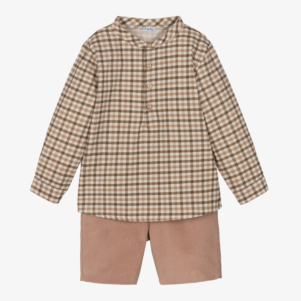 Smart casual two piece shorts set for boys by traditional Spanish brand Mebi. The collarless beige, cotton shirt is checked in contrasting beige and green, and has a half placket fastening with wood-effect buttons. The beige, cotton corduroy shorts have a comfortable, elasticated waistband and a soft voile lining for comfort. They are easy to wear, simply pulling up. Mebi is a very small fitting brand, please choose a size up to allow room to grow.