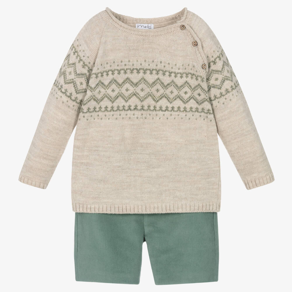 Classically styled, this beige and green shorts set for little boys is by Mebi. The sweater has a knitted pattern on the chest and sleeves, with a rolled collar and button fastenings on the raglan seam. A pair of fully lined cotton corduroy shorts finish the outfit. Mebi is a very small fitting brand, please choose a size up to allow room to grow.