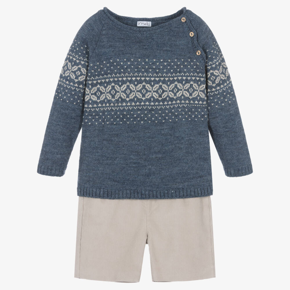 Classic shorts set for boys to wear on cooler days by traditional Spanish brand Mebi. The lovely blue wool and Alpaca blend sweater has a beige Fair Isle pattern on the front, back and sleeves. It has a roll-over ribbed collar and cosy ribbed trims, and fastens with wood-effect buttons on one shoulder to make dressing easy. The beige cotton corduroy shorts have a comfortable, elasticated waistband and a lightweight cotton lining. Easy to wear, they simply pull up.