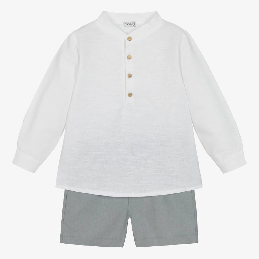 Smart casual white shirt and pale blue-grey shorts set for younger boys by Spanish brand, Mebi. The lightweight, collarless linen shirt has coconut button fastenings on the front and cuffs. It comes with lightweight cotton and linen blend shorts that have a comfortable elasticated waistband for easy pull-on.