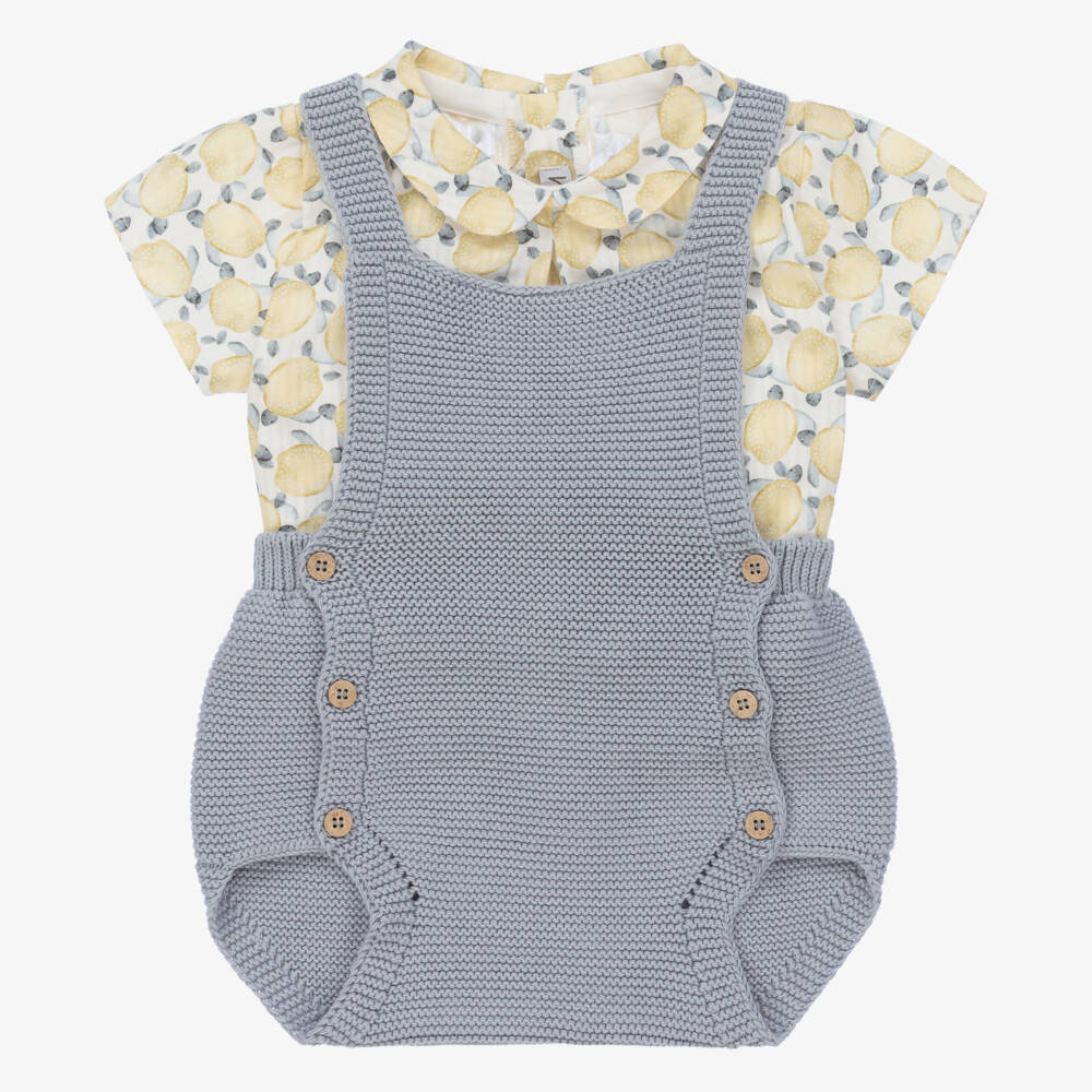 Classically styled shirt and dungaree shorts set for baby boys by Mebi, made in soft cotton. The grey-blue shorts are softly knitted and have gently ribbed trims. Patterned in a lovely turtle print in yellow and green, the ivory top has a sweet rounded collar and a pleated detail on the front. Both pieces have traditional wooden buttons for fastening.