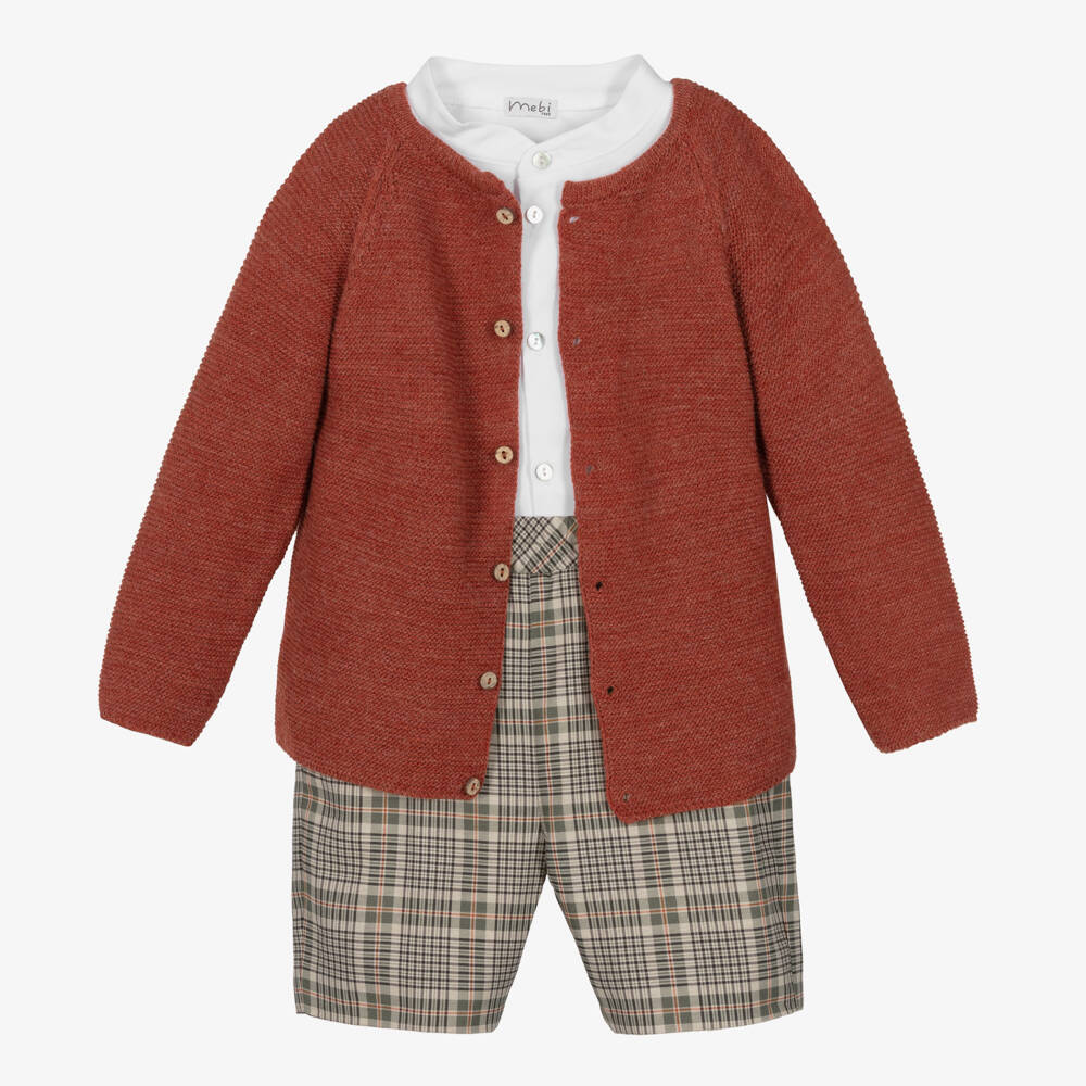 Smart casual three piece shorts set for boys by traditional Spanish brand Mebi. The white, cotton-blend twill shirt has a mandarin collar and fastens with lovely, iridescent mother-of-pearl buttons on the front and cuffs. The beautifully soft, terracotta red cardigan is knitted in a wool, viscose and alpaca blend, and fastens with wood-effect buttons on the front. The green tartan shorts are made in soft cotton twill, with a comfortable, elasticated waistband and a soft voile lining for comfort. They are easy to wear, simply pulling up. Mebi is a very small fitting brand, please choose a size up to allow room to grow.