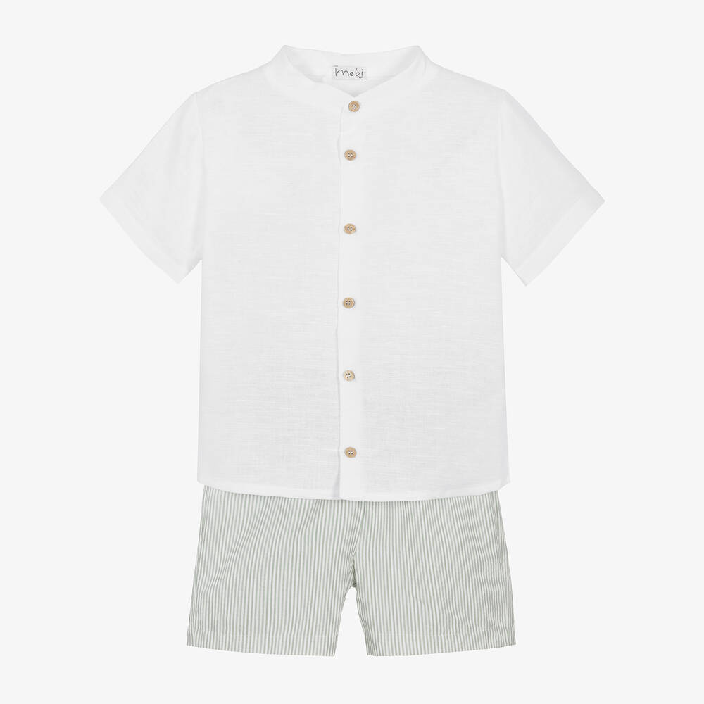 From traditional Spanish brand Mebi, a charming green stripe shorts set for little boys. Made in a lightweight cotton and linen blend, the white short sleeve collarless shirt fastens with wooden buttons. It comes with a pair of green stripe cotton shorts. Comfortable to wear, they have a gently elasticated waistband. Mebi is a very small fitting brand, please choose a size up to allow room to grow.