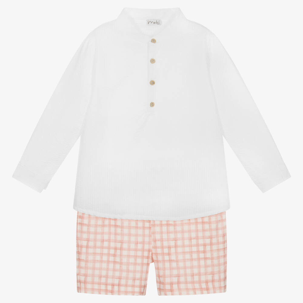 Classically styled shirt and shorts set for boys by Mebi, made in lightweight cotton. The white collarless shirt is woven with a fine stripe and has traditional wooden button fastenings on the short placket and on the cuffs. The pink and white gingham shorts are gently elasticated around the waist for comfort and easy pull on.
