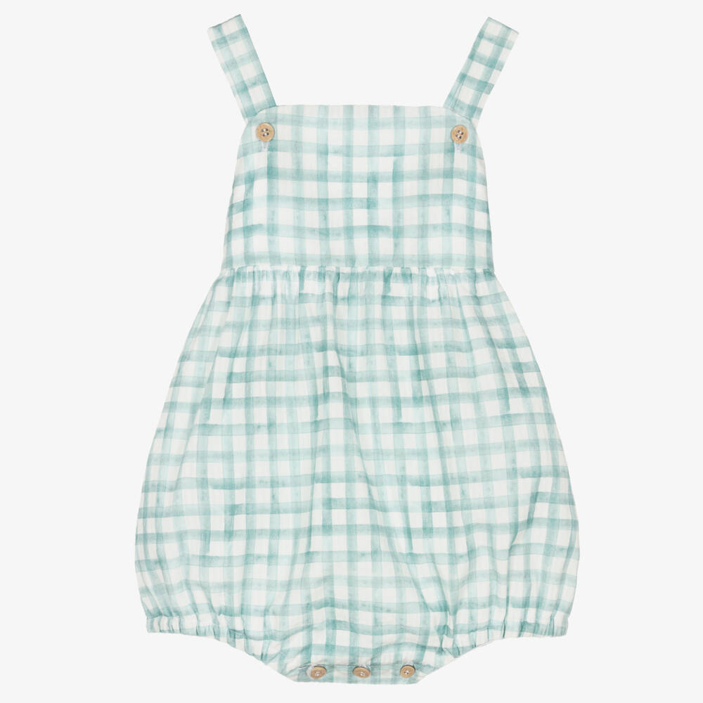 Cute gingham check shortie for baby boys and girls by Mebi, in lovely blue-green checks on a white background. Made in lightweight and breathable cotton for comfortable wear, it is elasticated around the back and on the leg cuffs. There are coconut button fastenings on the shoulder straps and between the legs.
