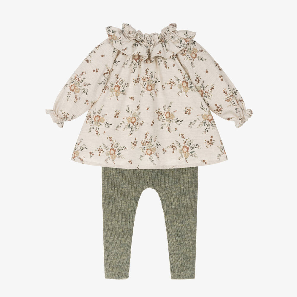 Beautifully styled, this beige and khaki green leggings set for little girls is from Mebi. The cotton blouse has a charming floral pattern, with an elasticated frilly collar and cuffs. It has button fastenings on the back. This outfit is complete with stretchy knitted leggings. Mebi is a very small fitting brand, please choose a size up to allow room to grow.