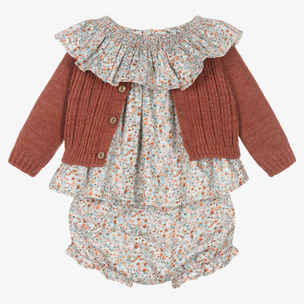 Adorable pale blue and brown shorts set for little girls from Spanish brand Mebi, with a ditsy floral print. Made in soft and lightweight cotton twill, the long-sleeved top has a lovely ruffled neckline with pretty shirring detail and elasticated cuffs. The matching, comfortable shorts have elasticated ruffle trims. Completing the cute, traditional look is a brown knitted crew neck cardigan with a touch of wool for luxurious warmth.