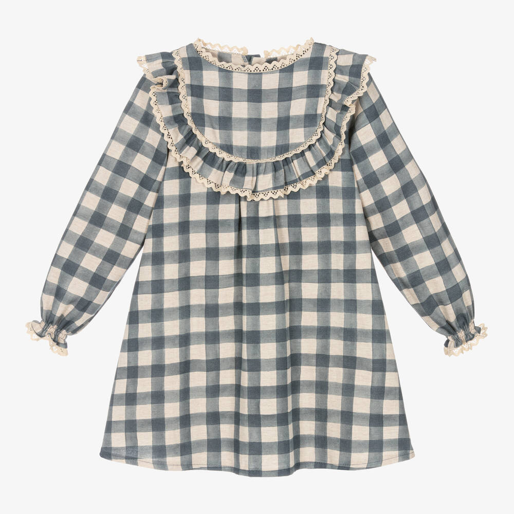 In a deep shade of blue and ivory, this checked dress for girls by Spanish brand Mebi, is made in a soft and lightweight cotton twill. Classically styled, it has a traditional bib front and long sleeves with gently elasticated frilled cuffs. Fastening on the back with wooden buttons, the dress is trimmed with dark ivory lace to complete the charming look. Mebi is a very small fitting brand, please choose a size up to allow room to grow.