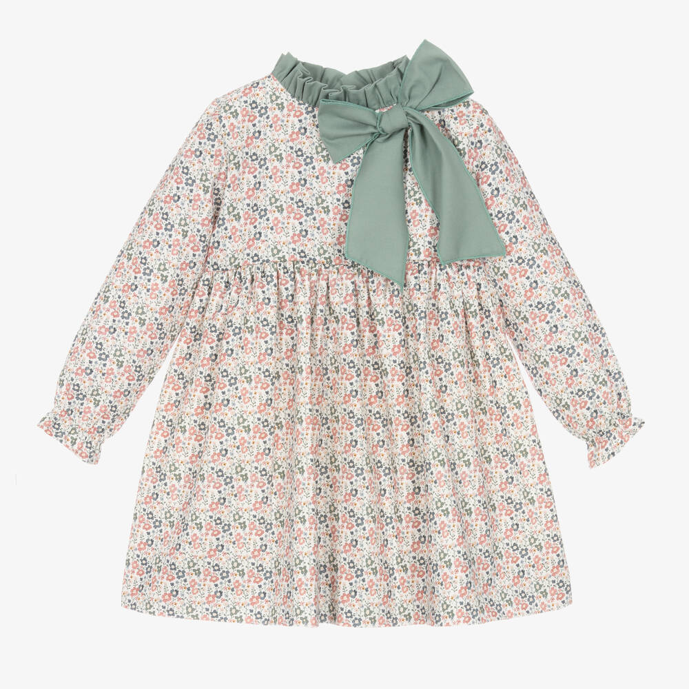 In pretty shades of sage green and ivory, this floral dress for girls is designed by Spanish brand, Mebi. Softly woven in lightweight cotton, it has a high, ruffle neckline, long, puffed sleeves with fluted cuffs, and a statement bow appliqué on the bodice. It fastens neatly with buttons on the back and is lined in soft cotton voile for gentle comfort against the skin.