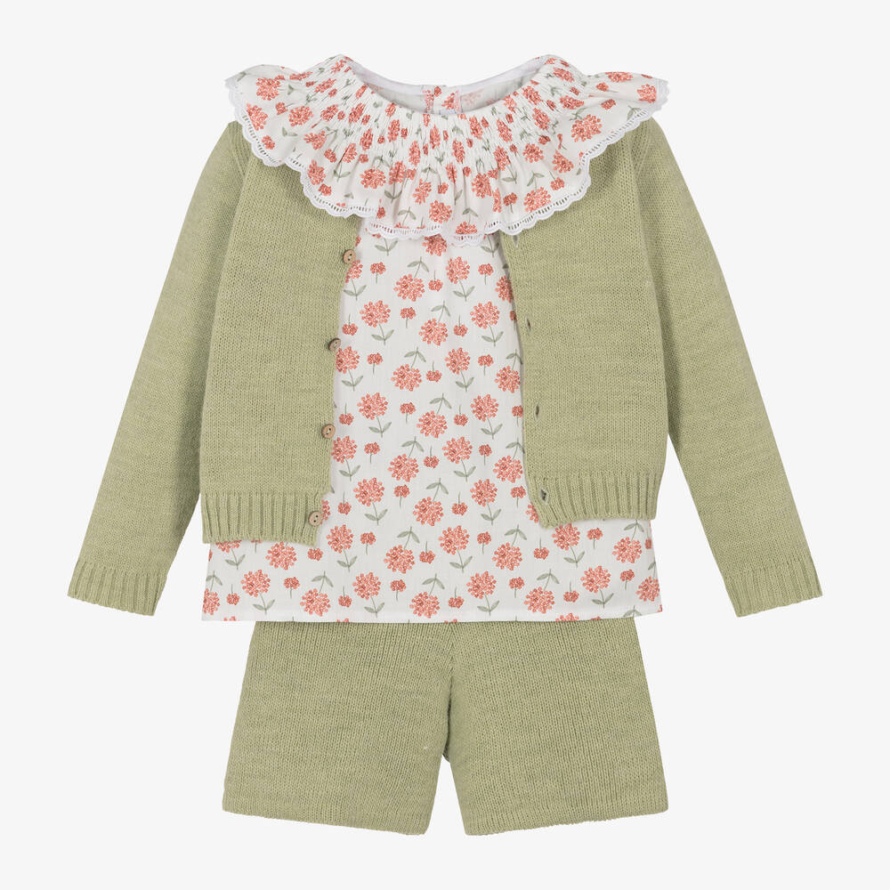 A charming green shorts set for little girls by Mebi. Made from a soft wool-blended knit, the long-sleeved cardigan fastens with beige buttons on the front and the coordinating shorts have a comfortable ribbed elasticated waistband. The ivory blouse is made from smooth cotton twill and is patterned with a pretty muted red and green floral print. Fastening with mother-of-pearl buttons on the back, it has a statement collar with shirred detailing and a pretty scalloped trim for a sweet finish. Mebi is a very small fitting brand, please choose a size up to allow room to grow.