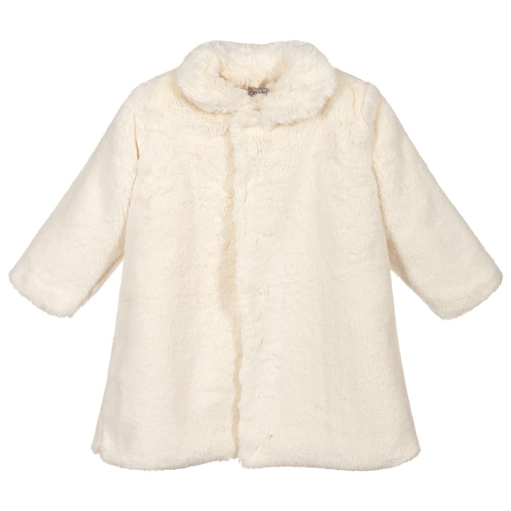 A gorgeous ivory coat for little girls by Mebi, made in beautifully soft faux fur with a knitted lining. It fastens with concealed buttons on the front.