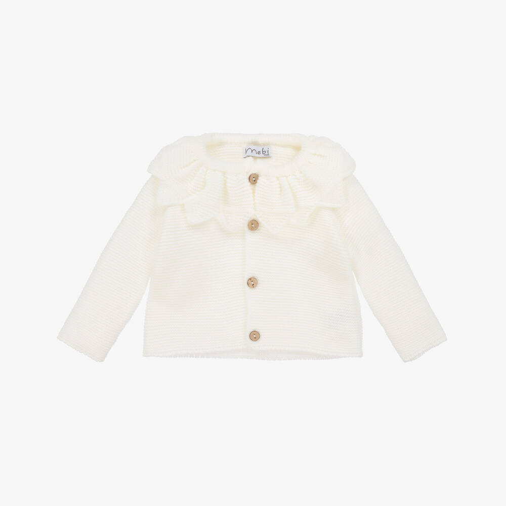 Super sweet, this ivory long-sleeved cardigan for little girls is by Mebi. Made from a soft knit, it has a charming gathered collar with zig-zag edging for a fun and adorable look. It fastens with beige buttons on the front for a neat finish. Mebi is a very small fitting brand, please choose a size up to allow room to grow.