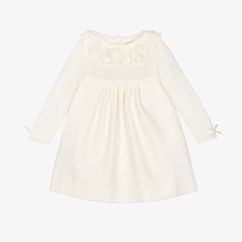 Designed by Mebi, this gorgeous ivory dress for little girls is simple and timeless. The knitted bodice is decorated with a statement ruffle collar, layered with ivory Chantilly lace for a classic feel. Delicate satin bows decorate the picot-trimmed cuffs. The gathered skirt flares into a full shape and is lined in soft cotton voile for comfort against the skin. It fastens with iridescent ivory buttons on the back.