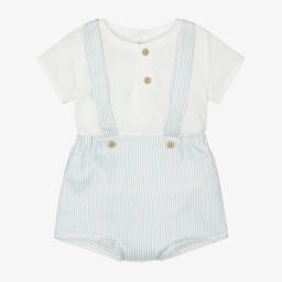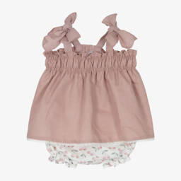 Cute white and pink cotton shorts set for little girls by Mebi. Lovely and lightweight, the pretty top is patterned with a charming floral print in pink, blue and yellow. The bodice is lightly ruched for comfort and the shoulder straps are trimmed with pretty pink bows. A pair of gently elasticated shorts complete the sweet look.