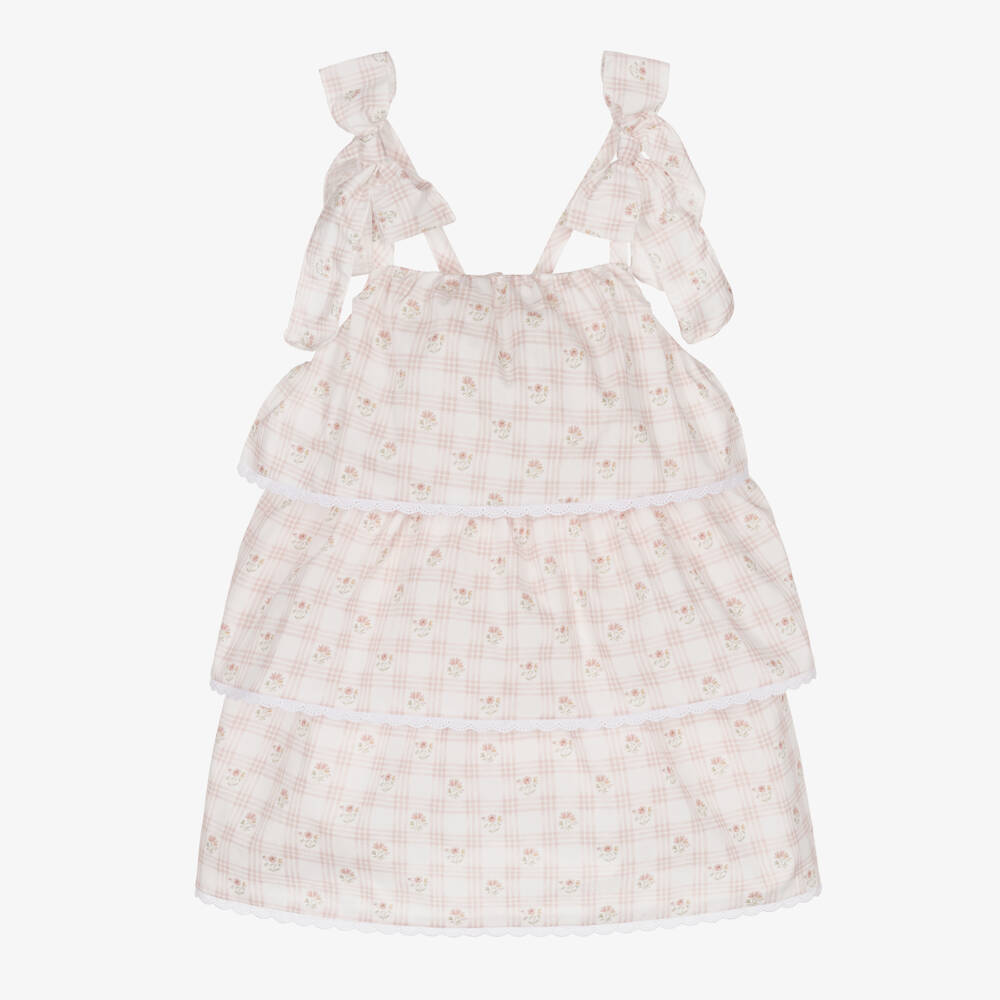 A beautiful ivory and dusky pink dress for girls by Spanish brand Mebi, made in soft, lightweight cotton. Delicate and flowy, it is patterned in a charming floral check, with pretty bows on the straps. The ruffled layers are decorated with embroidered scallop trims. There are button fastenings on the back.