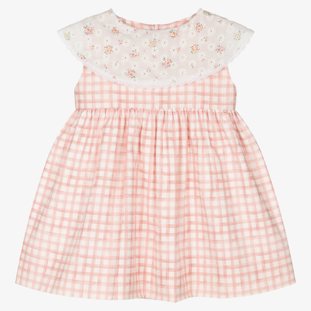 Delightful vintage pink and white gingham check dress for girls by Spanish brand, Mebi. Made and lined in lightweight cotton for comfort, this sleeveless design has a white broderie anglaise collar with a pink floral pattern and delicate scalloped trim for a classic look. It fastens on the back with little coconut buttons.