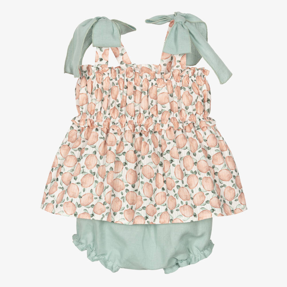 Classically styled top and shorts set for little girls by Mebi. Patterned in a lovely pink and green turtle print, the cotton top has an elasticated bodice with pretty green bows on the shoulder straps. It fastens with traditional wooden buttons on the back. The green linen and cotton blend shorts match the bows on the top, and are gently elasticated for comfort around the waist and legs.
