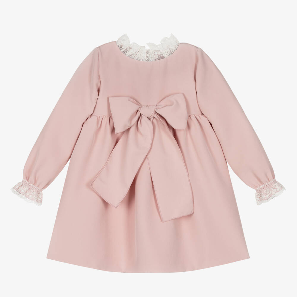 Pretty pink dress for girls by traditional Spanish brand Mebi, just right for special occasions. Made in super soft satin twill, it has a lovely ivory lace ruffle around the collar, with a matching ruffle around the gently elasticated cuffs. It has a full, gathered skirt with a large, fixed bow on the waistline and a cotton voile lining for comfort. The dress fastens with iridescent mother-of-pearl buttons around the back. Mebi is a very small fitting brand, please choose a size up to allow room to grow.