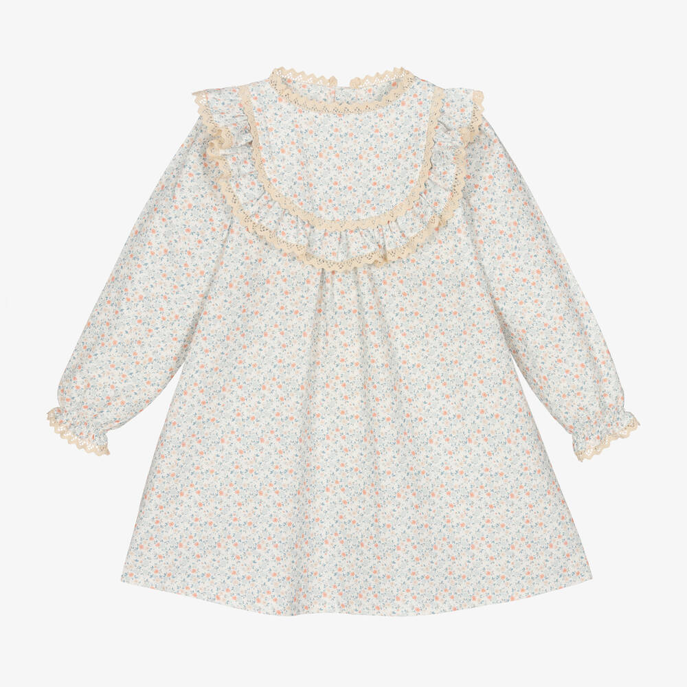 Pretty white dress for girls by Mebi, softly woven in lightweight cotton twill. This floaty, floral-print style has a traditional bib front, accented with dark ivory lace trims. The long, puffed sleeves have sweet, fluted cuffs with coordinating lace. It fastens with buttons on the back for a classic finish.