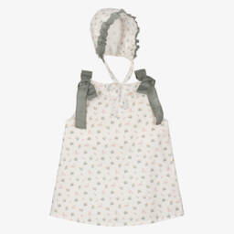 From Spanish brand Mebi, a sweet white cotton dress set for little girls. Patterned with a floral print in muted tones of red, blue and yellow, this lovely A-line dress has green bows on the shoulders. A matching bonnet with green ruffle detailing completes the look.