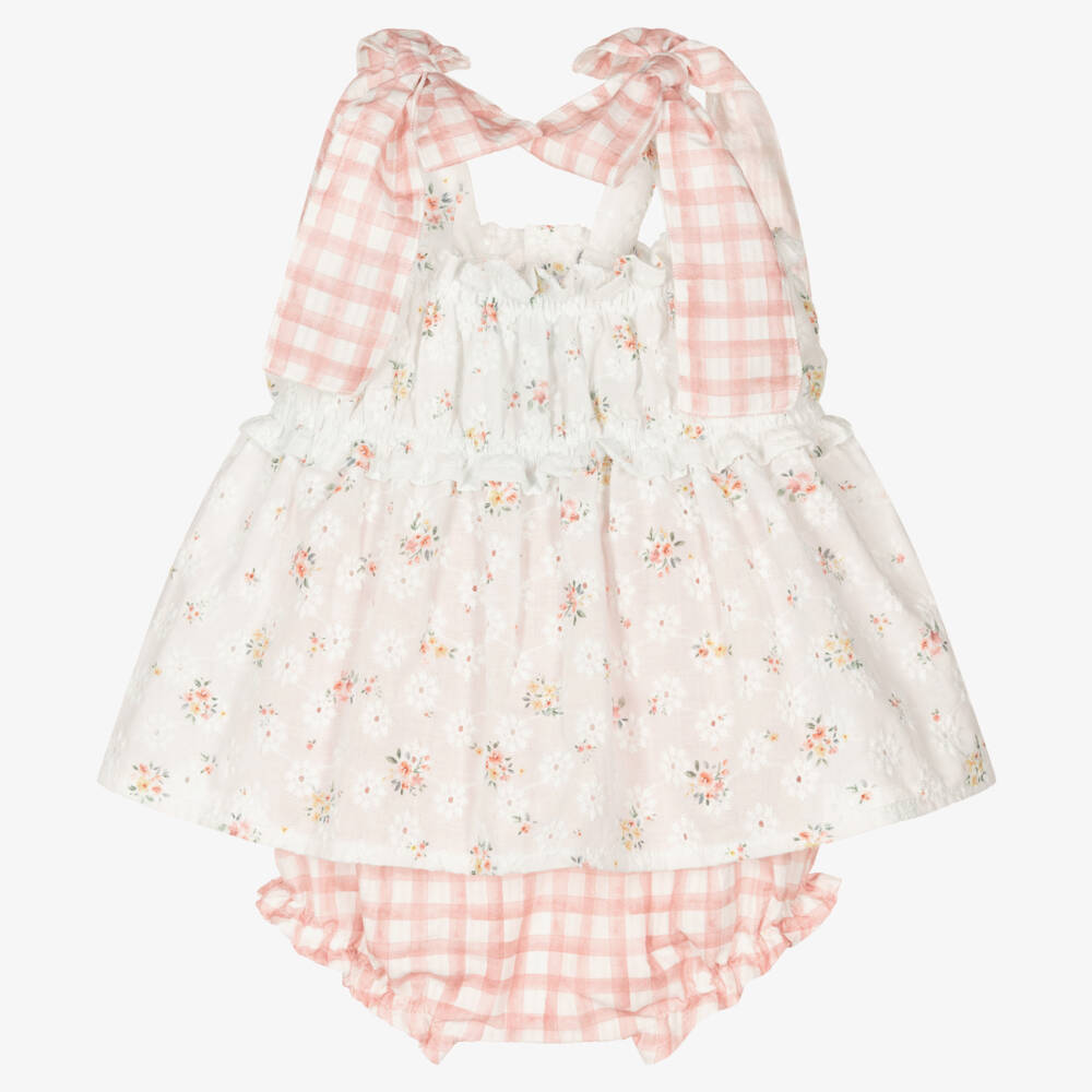 Classically styled top and shorts set for little girls by Mebi, made in lightweight cotton. Patterned in a pretty pink and green floral print with broderie anglaise detailing, the top has an elasticated bodice with pink gingham bows on the shoulder straps. It fastens with traditional wooden buttons on the back. The pink gingham shorts are gently elasticated around the waist and legs for a comfortable fit.