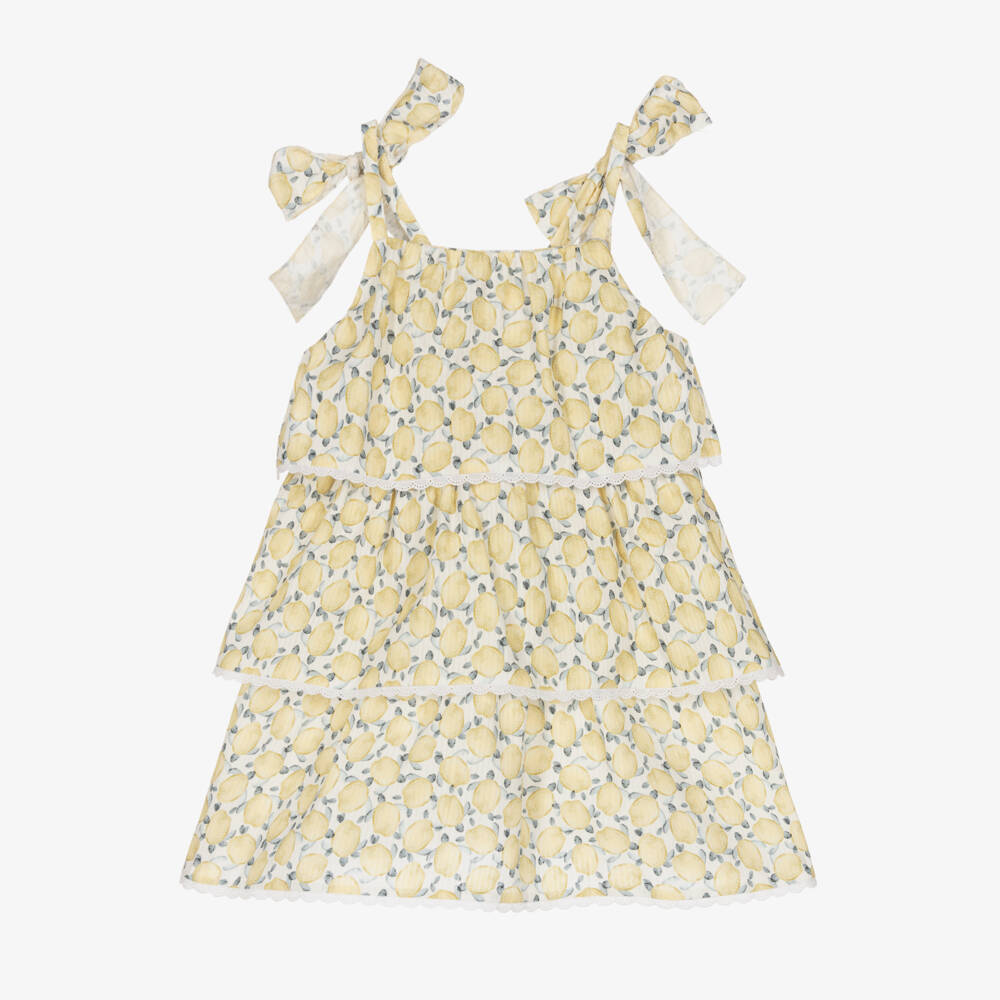 Exclusive to Childrensalon, a beautiful white and yellow dress for girls by Spanish brand Mebi, made in soft, lightweight cotton. Delicate and flowy, it is patterned in a charming turtle print, with pretty bows on the straps. The ruffled layers are decorated with embroidered scallop trims. There are button fastenings on the back.