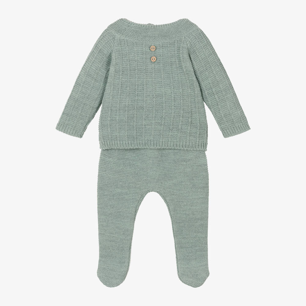 A lovely sea green two-piece babygrow for boys and girls by Mebi. Simply styled, the long-sleeved top has beige button decorations on the chest and matching button fastenings on the reverse. The coordinating bottoms have a stretchy ribbed waistband for comfortable wear. Mebi is a very small fitting brand, please choose a size up to allow room to grow.