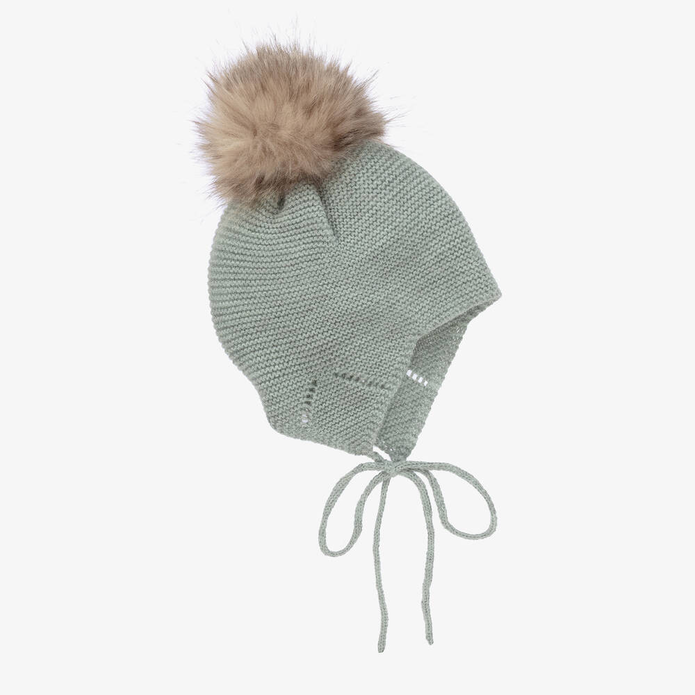 Cute green-grey marl knitted hat for little boys and girls by Spanish brand Mebi. It has an adorable faux fur pom-pom on the top and ties under the chin.