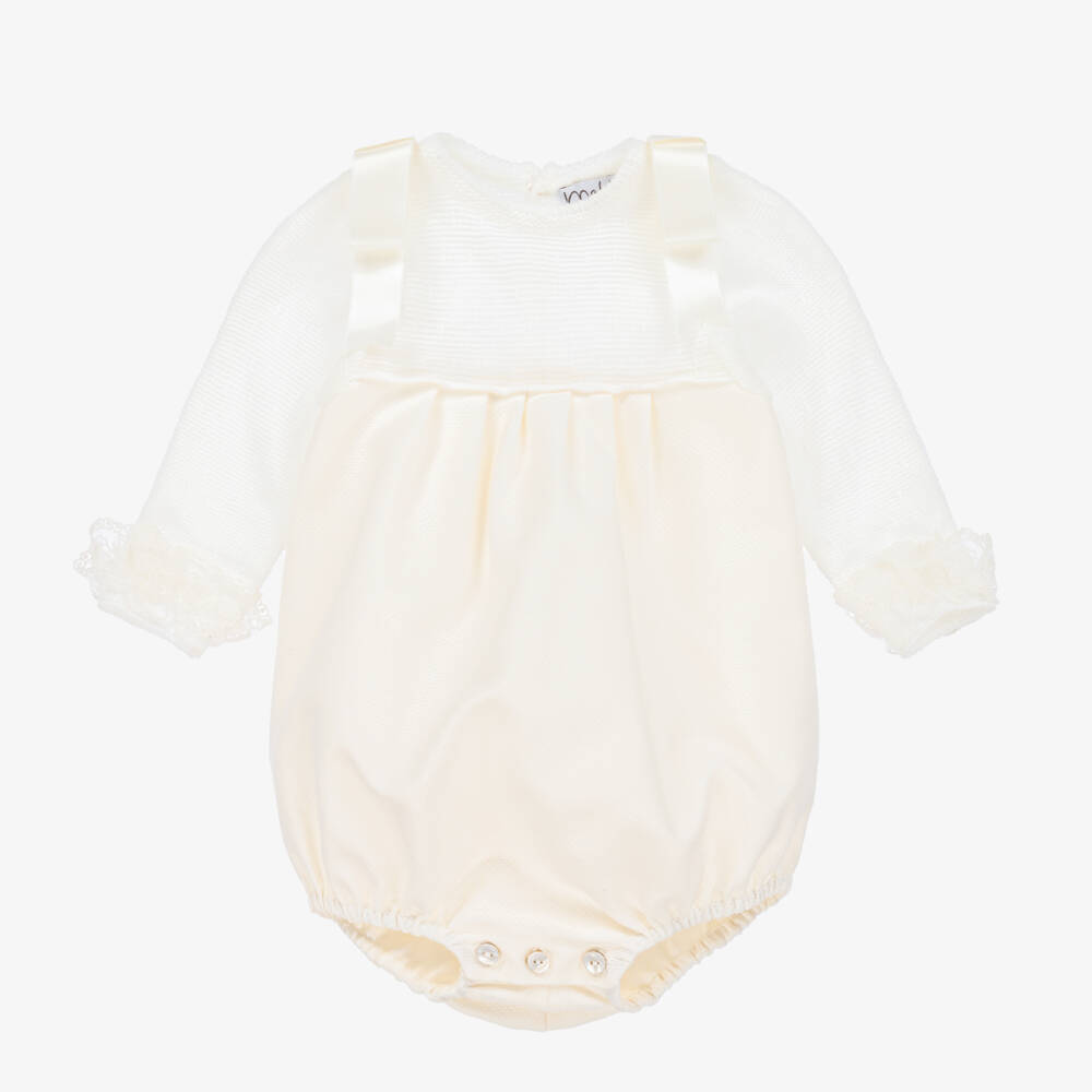 Sweet ivory ceremony shortie for baby boys and girls by traditional Spanish brand Mebi, ideal for christenings or special occasions. The knitted bodice has a subtle line pattern, with large, fixed satin bows on the shoulders and ivory lace trims on the cuffs. The long, honeycomb-patterned body is made in soft cotton, with pleats from the bodice, gently elasticated cuffs and a voile lining for comfort. It fastens on the back with little mother-of-pearl buttons. Mebi is a very small fitting brand, please choose a size up to allow room to grow.