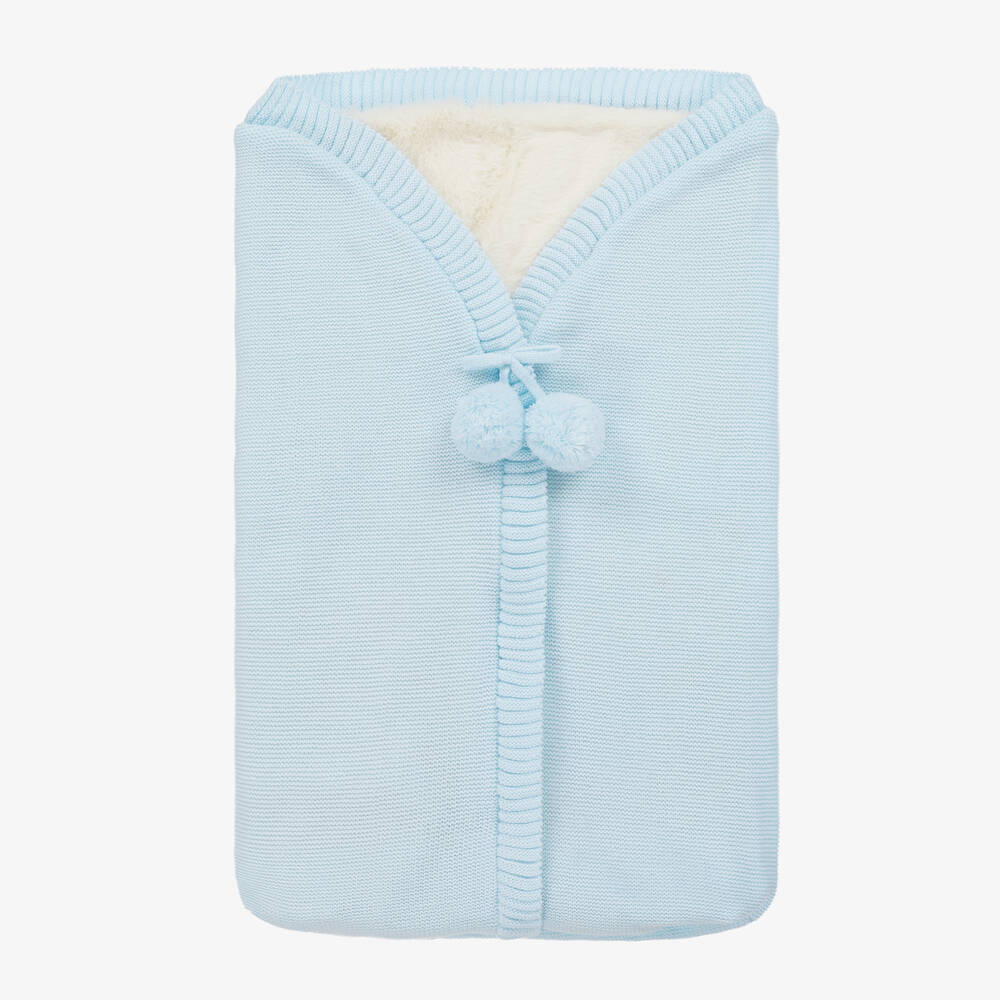 Super snuggly, knitted baby nest for boys and girls by Spanish brand Mebi, in a lovely light blue shade. It is lined in luxuriously soft ivory plush faux fur to keep your little one cosy and has a concealed front zip fastening. There are ribbed trims and decorative pom-poms on the front.