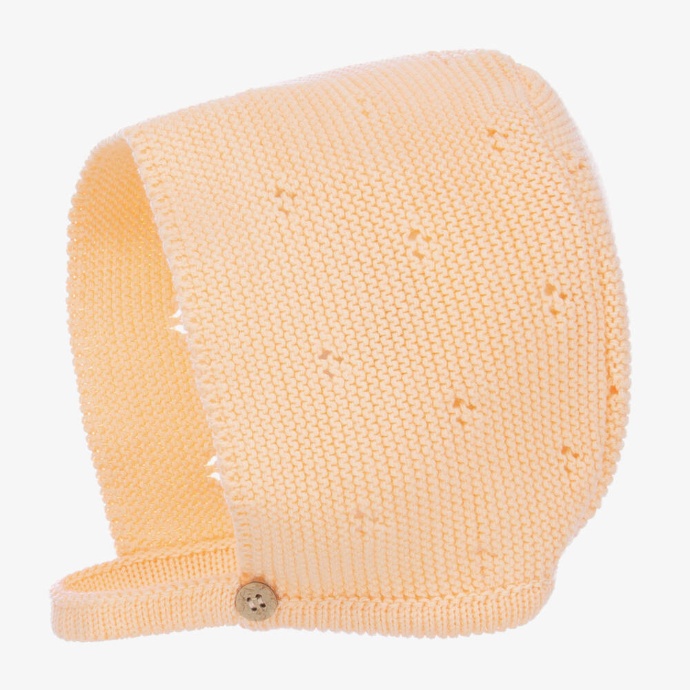 Cute pale coral orange bonnet for baby girls by Mebi, knitted from soft cotton and fastening under the chin with a button fastening strap.