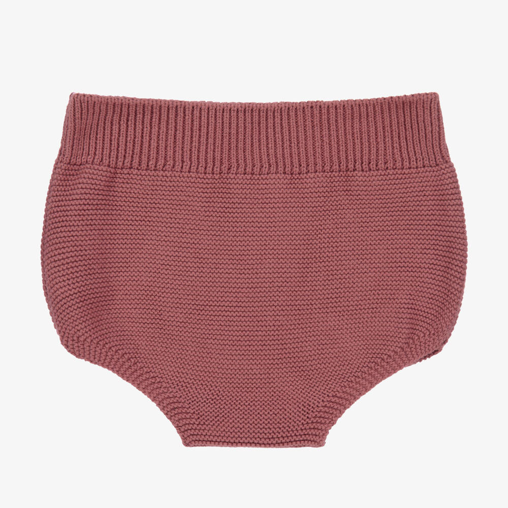 Dark pink knitted bloomers for baby girls and boys by Spanish brand, Mebi. Made in soft cotton yarn, these sweet shorts have a gently elasticated waistband.